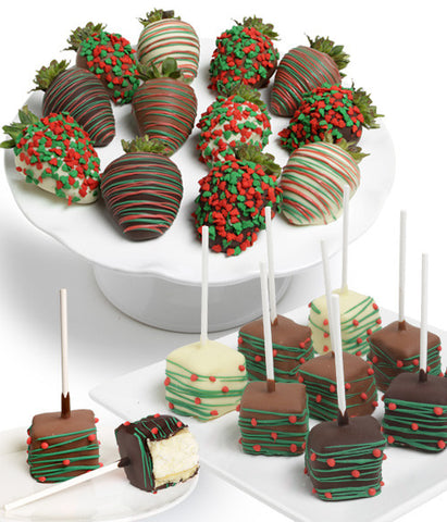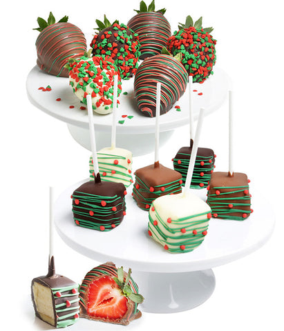 Looking for food gifts for Christmas? Our Cheesecake Pops and Strawberries Combo is one of our most popular holiday food gifts. Strawberries are hand-dipped by our Artisans in our gourmet chocolate (Milk,dark, and white Belgian Chocolates). Our Cheesecakes Pops are rich and creamy and drenched in Belgian chocolate and painted to look like Christmas Trees. Arrives in an elegant gift box.