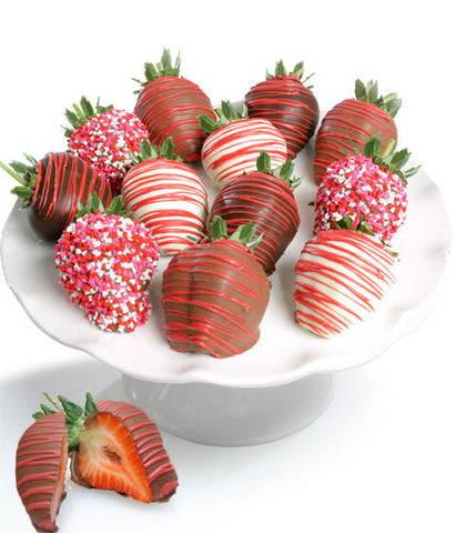 Show how much you care by sending our Valentine's Day Chocolate Covered Strawberries. Our Berries are hand dipped in an assortment of our delicious milk, decadent dark, and heavenly white Belgian chocolates. Berries are artfully decorated with mini-heart sprinkles, and our signature red drizzle. Each assortment is carefully packaged in a beautiful gift box. Since these are hand made, no two will be exactly the same.